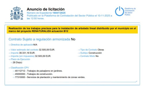 Ya se encuentra publicado el proceso de contratación de esta actuación en la Plataforma de Contratos del Sector Público.